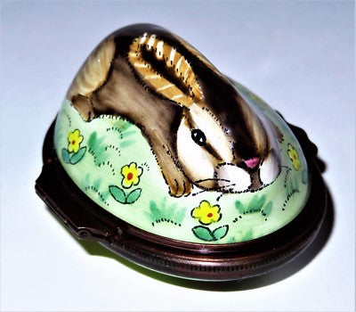 HALCYON DAYS ENAMEL BOX - BUNNY BONBONNIERE - BROWN RABBIT & YELLOW FLOWERS