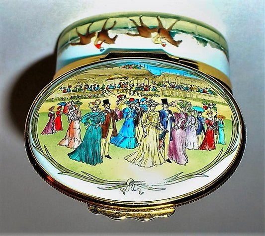 HALCYON DAYS ENAMEL BOX - ROYAL ENCLOSURE AT ASCOT RACES - EDWARDIAN TIMES - MIB
