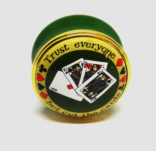 HALCYON DAYS ENGLISH ENAMEL BOX- "TRUST EVERYONE BUT CUT THE CARDS"