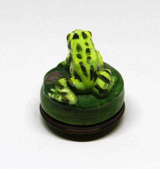 HALCYON DAYS ENAMEL BOX - SPOTTED GREEN & YELLOW FROG BONBONNIERE - WATER LILY