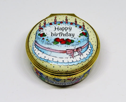 HALCYON DAYS ENAMEL BOX - STRAWBERRY "HAPPY BIRTHDAY" CAKE - CANDLES & BALLOONS