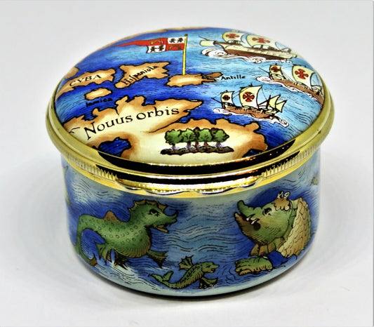 HALCYON DAYS ENAMEL BOX -TIFFANY & CO.- MAP & CHRISTOPHER COLUMBUS SAILING SHIPS
