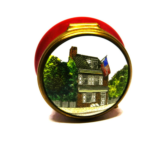 HALCYON DAYS ENGLISH ENAMEL BOX -BETSY ROSS HOUSE- PHILADELPHIA -U. S. FLAG- MIB