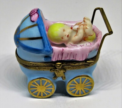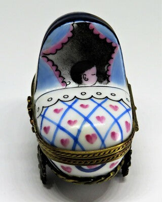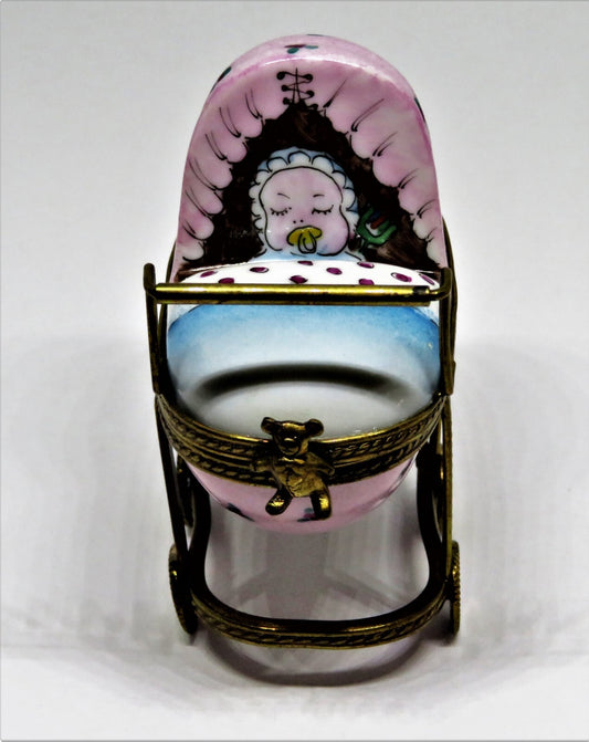 LIMOGES BOX~ BABY IN PINK & BLUE CARRIAGE ~ PRAM ~ BOTTLE INSIDE ~ PEINT MAIN