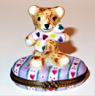 LIMOGES FRANCE BOX- CHAMART - "FIRST TOOTH" TEDDY BEAR -BOW & HEARTS- BABY TEETH