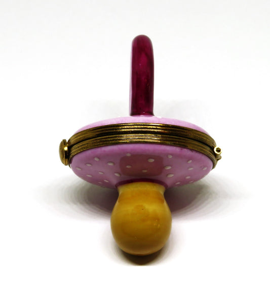 LIMOGES BOX~ PIERRE ARQUIE ~ PINK & BURGUNDY BABY PACIFIER ~ WHITE DOTS ~ 26/750