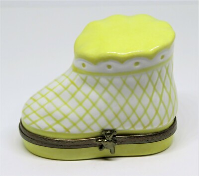 LIMOGES FRANCE BOX ~ YELLOW BABY BOOTEE & REMOVABLE BOTTLE ~ SHOE ~ PEINT MAIN