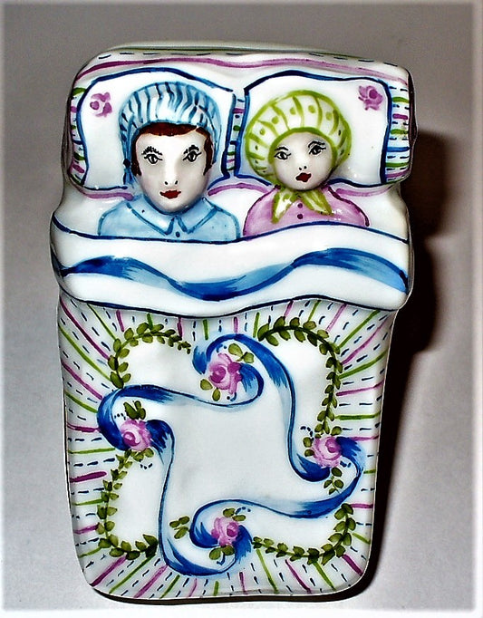LIMOGES BOX - COUPLE IN BED - FLORAL BLANKET - RIBBONS & ROSES - BABY & CRADLE