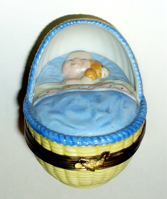 LIMOGES FRANCE BOX - ROCHARD - BABY GIRL IN A BASKET - ROSES & BOW & HEART - BIB