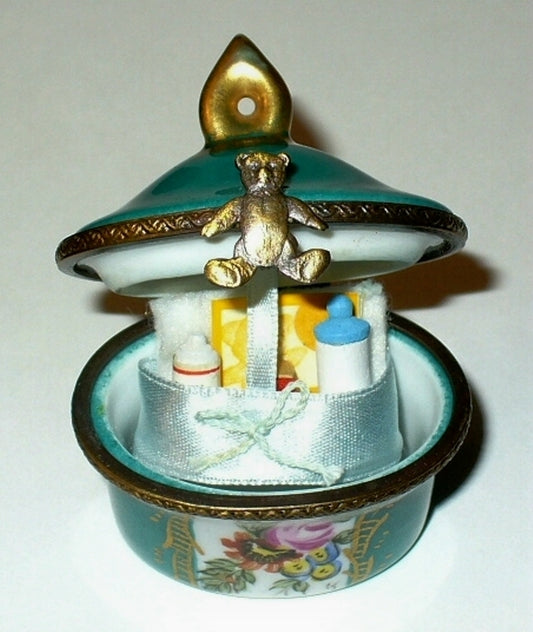 LIMOGES BOX~ BABY & BOTTLE IN PINK & BLUE CARRIAGE ~PRAM~ TEDDY BEAR ~PEINT MAIN