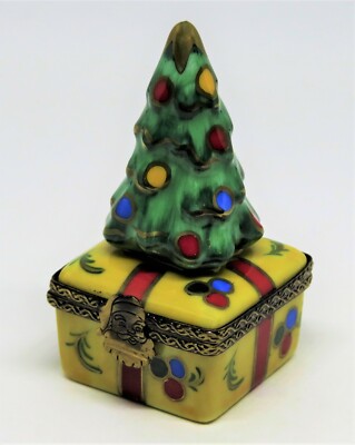 LIMOGES FRANCE BOX - CHRISTMAS TREE ON A PRESENT BASE - SANTA CLAUS CLASP
