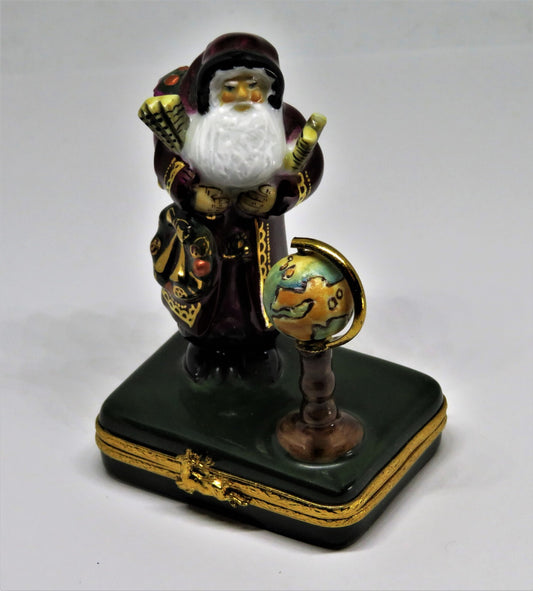 LIMOGES FRANCE BOX- CHRISTMAS - LYNN HANEY - "GLOBE SANTA CLAUS" - MAPS & WREATH