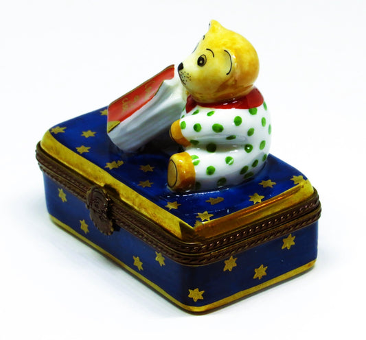 LIMOGES FRANCE BOX -PARRY-VIEILLE- TEDDY BEAR & BOOK OF CHRISTMAS STORIES -STARS