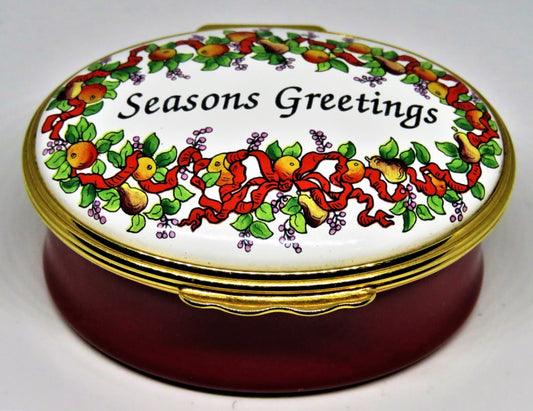 HALCYON DAYS ENAMEL BOX - "SEASONS GREETINGS" - CHRISTMAS WREATH - MISTLETOE
