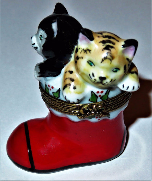 LIMOGES BOX - CHRISTMAS - SANTA CLAUS BOOT & KITTENS - CATS - HOLLY