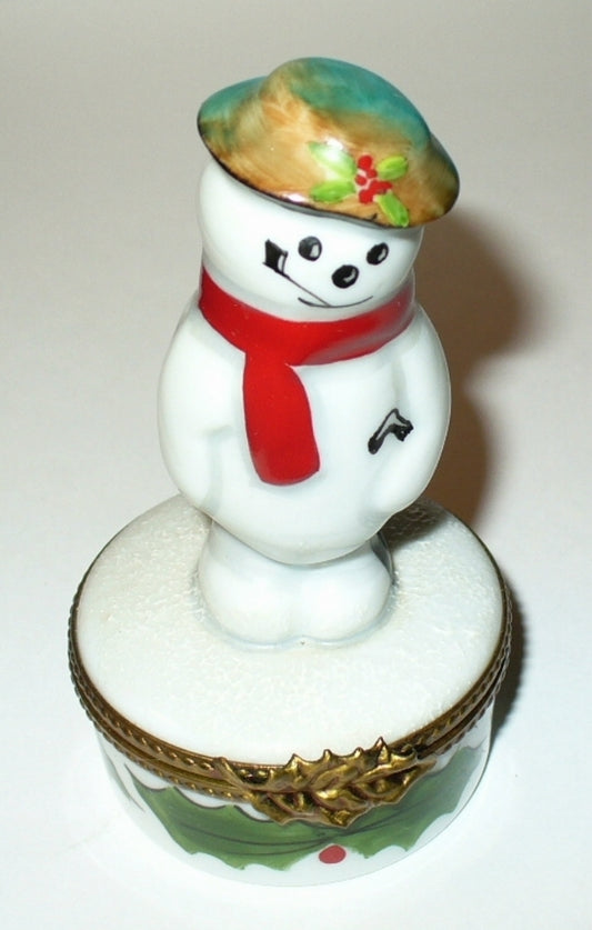 LIMOGES FRANCE BOX- ROCHARD - CHRISTMAS -SNOWMAN & SCARF & HAT & UMBRELLA- HOLLY
