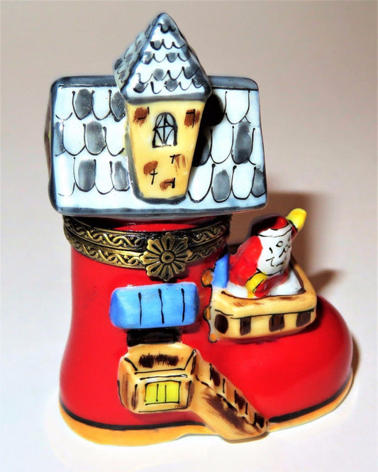 LIMOGES FRANCE BOX ~CHRISTMAS~ SANTA CLAUS WAVING FROM A BOOT HOUSE ~ PEINT MAIN