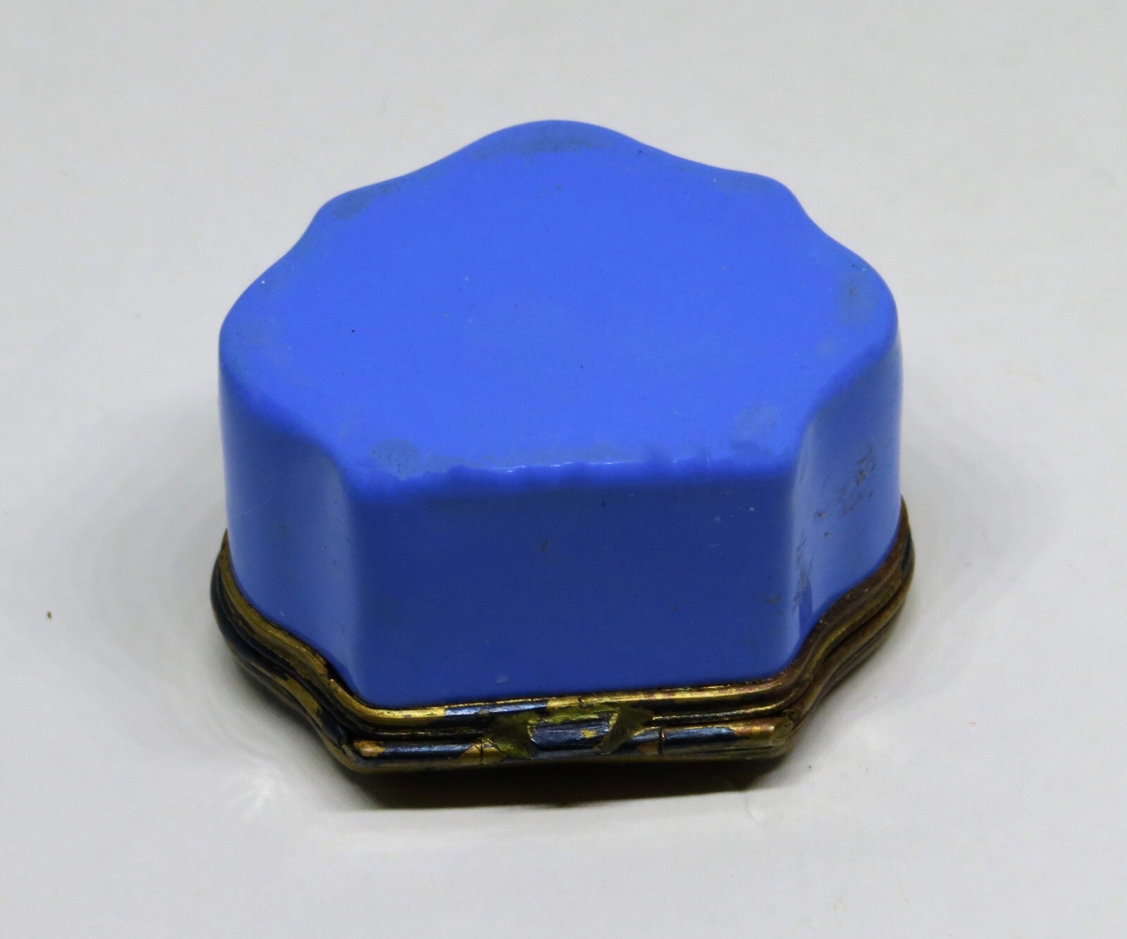 This antique, enamel box is an irregularly shaped blue chest, with two men, in long red coats and black top hats, riding bicycles, with a brown dog on the grass. "The Hobby Horse" is written on top. The bicycle, invented in 1817, didn't have pedals, and they were called "dandy horses." The condition, considering its' age, is excellent. There are some scratches inside, but the outside enamel is perfect. It has a few discoloration spots on the metal and it doesn't close securely. Please check the pictures. It is 1.1" by 1.6" with a height of 1.1". PLEASE CHECK MY OTHER AUCTIONS FOR MORE BOXES - I'LL BE LISTING ADDITIONAL ONES LATER IN THE WEEK. PLEASE CHECK BACK OFTEN.