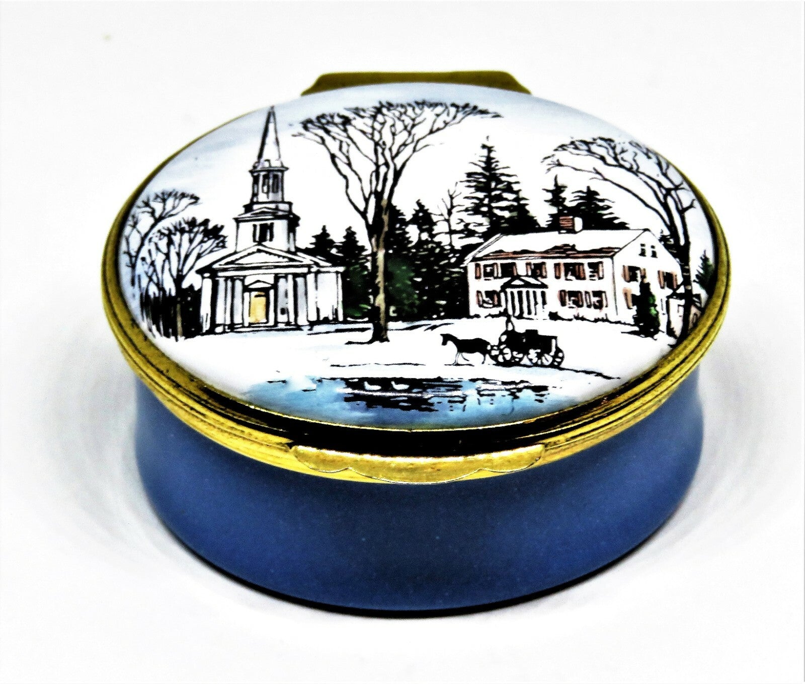 This lovely, Crummles, enamel box has an old-fashioned, quaint, village scene of a church, a large building, pine trees, barren trees, a horse drawn wagon and a pond, all covered with snow. "Historic Sandwich MASSACHUSETTS" is inside. The box is 1.5" by 1.75" with a height of .9". "Made Exclusively for Home For The Holidays LTD" and "English Enamels - Made in England" with the Crummles & Co. logo, in the center, are on the light blue base. PLEASE CHECK MY OTHER AUCTIONS FOR MORE BOXES - I'LL BE LISTING ADDITIONAL ONES LATER IN THE WEEK. PLEASE CHECK BACK OFTEN.