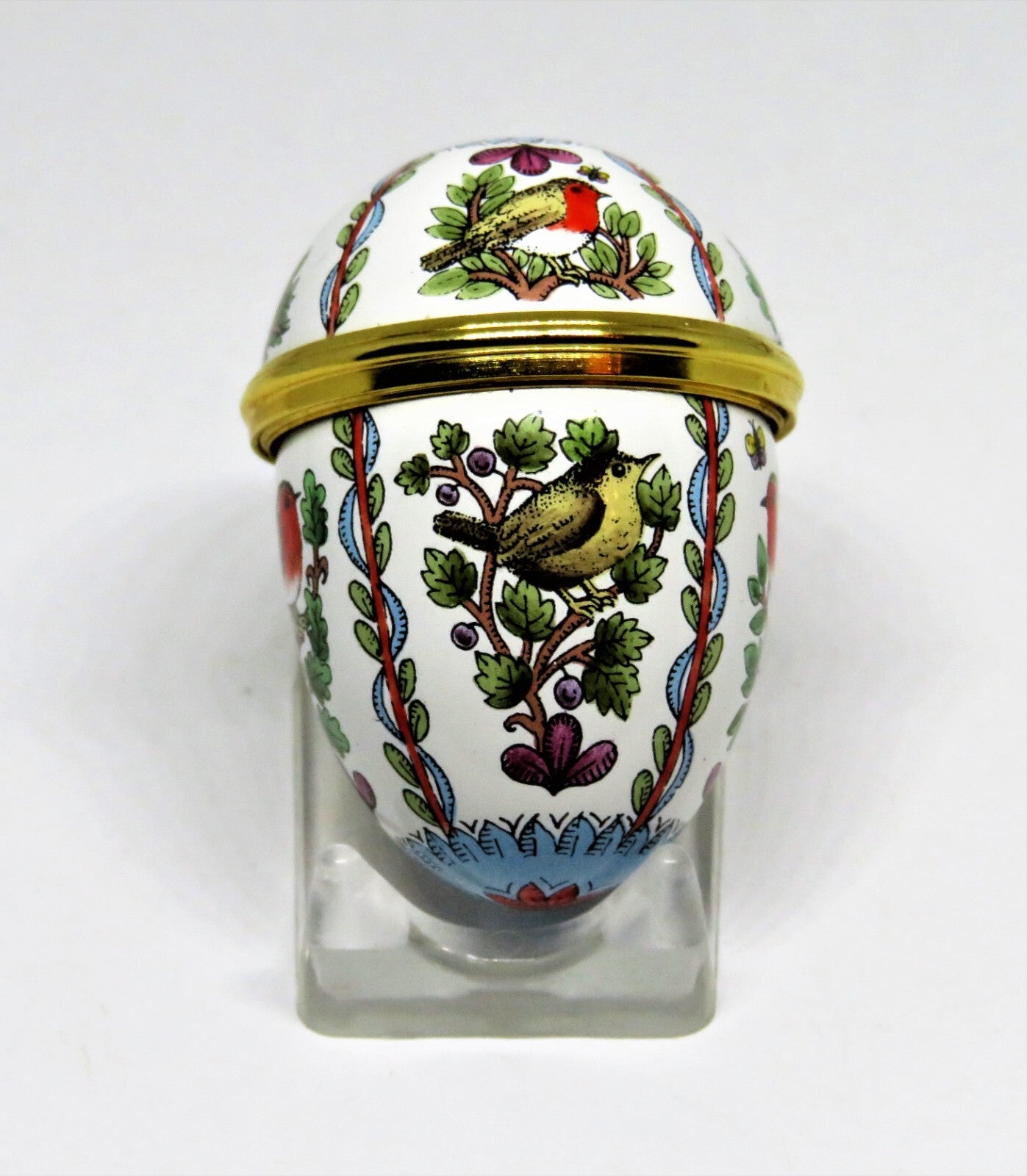 This lovely, Halcyon Days, two piece, egg shaped, enamel box has panels of robins, on tree branches, alternating with panels of sparrows. There are two butterflies, red borders with leaf vines, and scalloped blue circles, with red flowers, on the top and bottom. The egg has a diameter of 1.1" with a length of 1.6". "Halcyon Days Enamels - England - Bilston & Battersea Enamels Revival" is inside. It comes with the presentation case and an acrylic display stand. PLEASE CHECK MY OTHER AUCTIONS FOR MORE BOXES - I'LL BE LISTING ADDITIONAL ONES LATER IN THE WEEK. PLEASE CHECK BACK OFTEN.