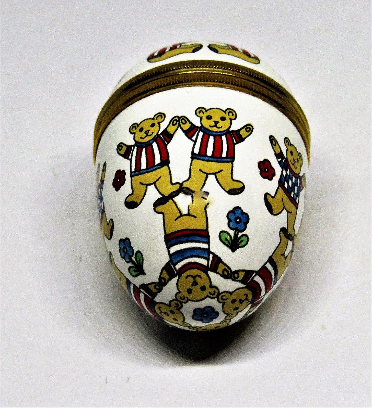 HALCYON DAYS ENAMEL BOX - EGG WITH TEDDY BEARS IN T-SHIRTS - FLOWERS