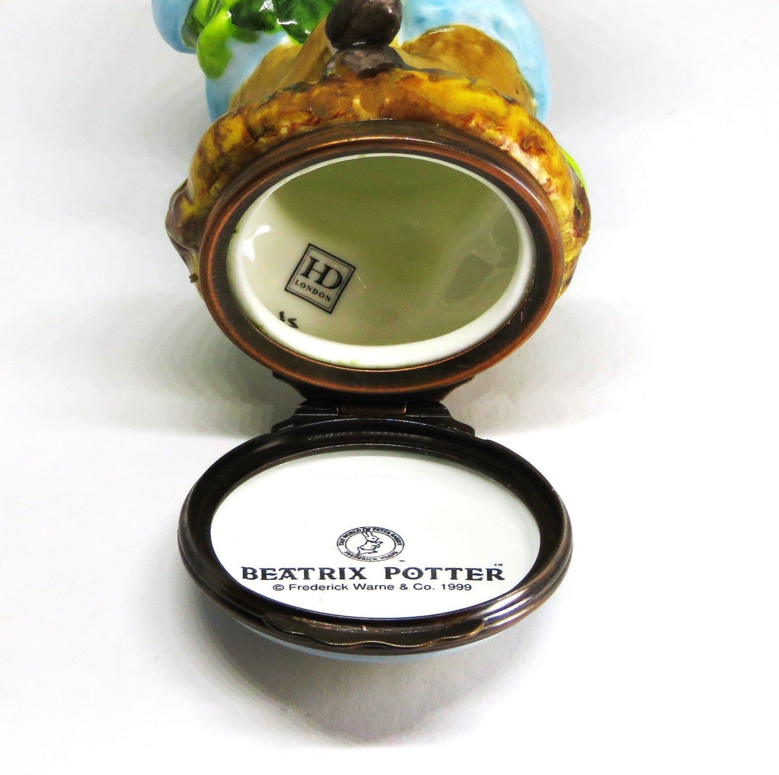 This wonderful, Halcyon Days Enamels bonbonniere, features Beatrix Potter's, Peter Rabbit, wearing his blue coat, eating one of the carrots he is holding, while sitting in Mr. McGregor's garden. A quote from "The Tale of Peter Rabbit", bordered by a blue band and carrots, is on the bottom. Inside is "The World of Peter Rabbit", "BEATRIX POTTER" and "© Frederick Warne & Co. 1999." "HD - London" with the artist's initials is on the inside top. It has a diameter of 1.3" with a height of 3". PLEASE CHECK MY OTHER AUCTIONS FOR MORE BOXES - I'LL BE LISTING ADDITIONAL ONES LATER IN THE WEEK. PLEASE CHECK BACK OFTEN.