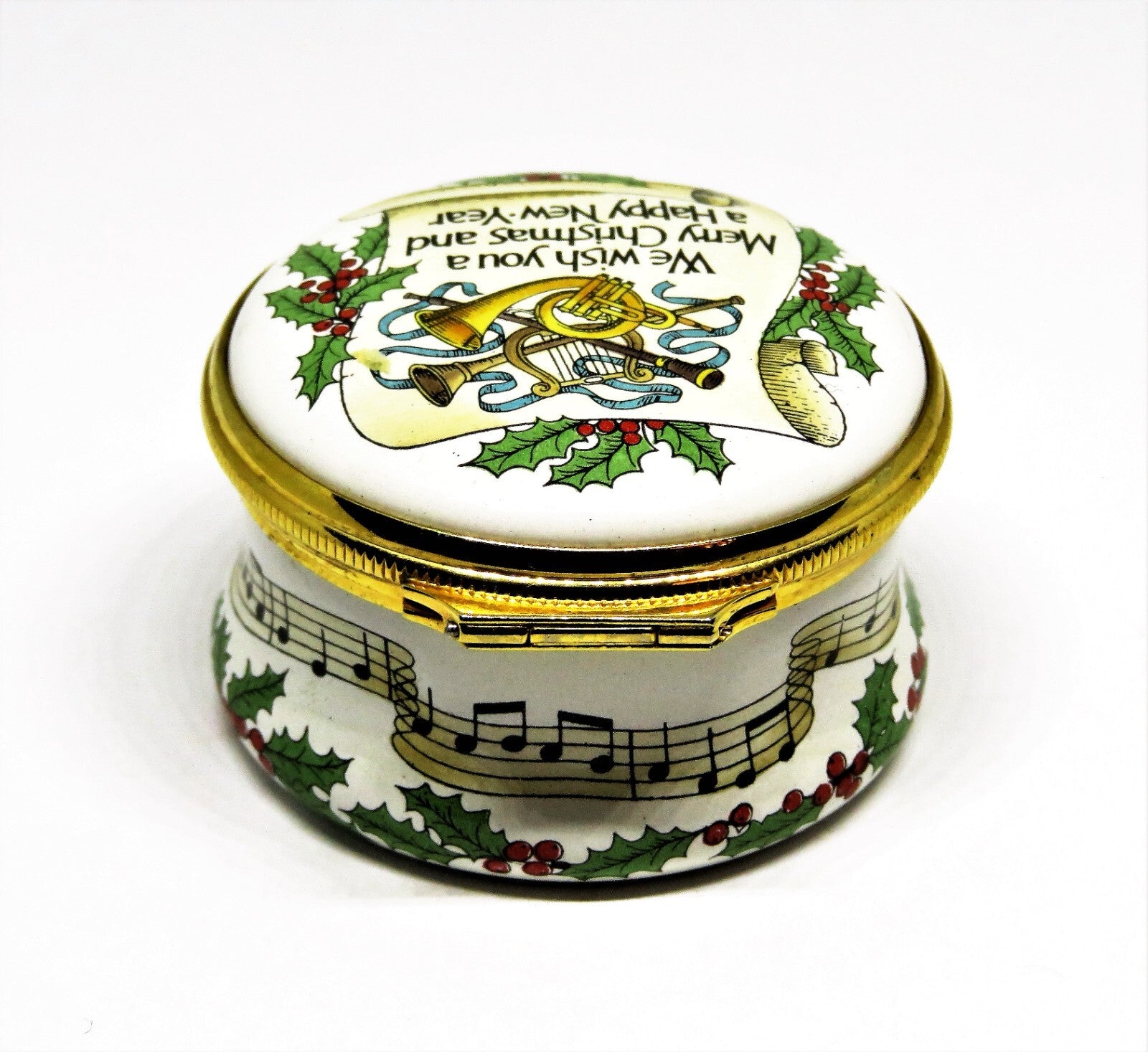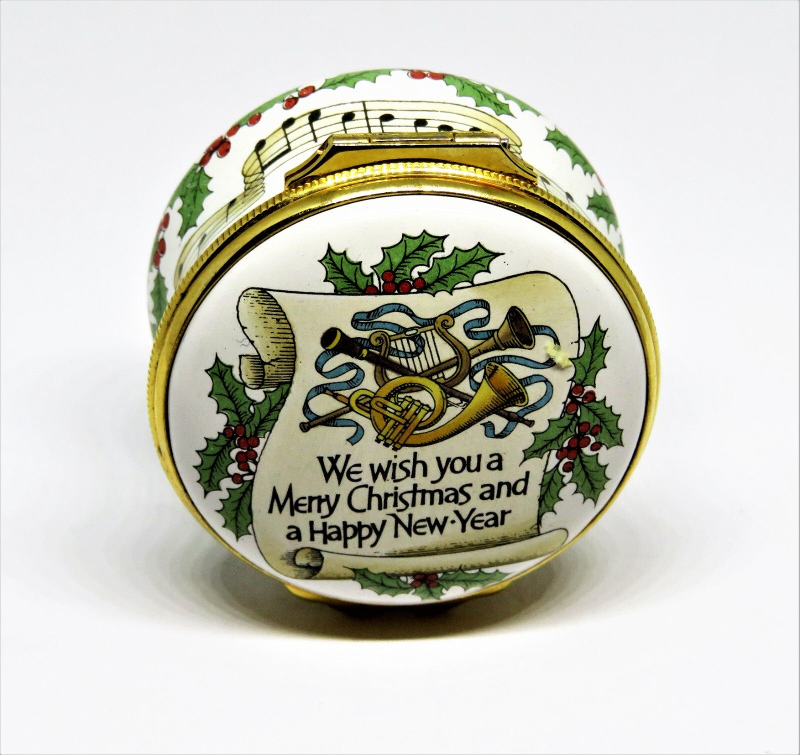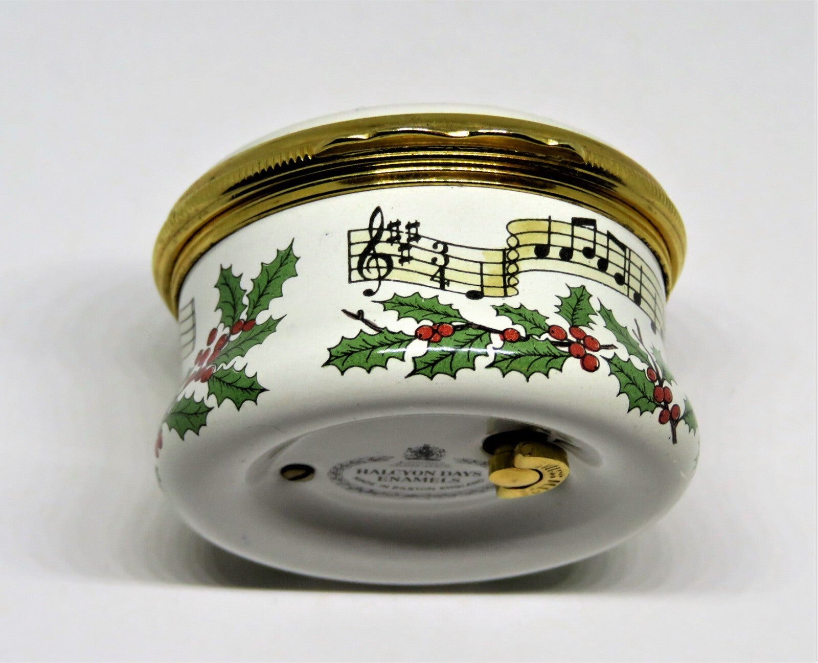 HALCYON DAYS ENAMEL MUSIC BOX - "WE WISH YOU A MERRY CHRISTMAS" - HOLLY - MIB