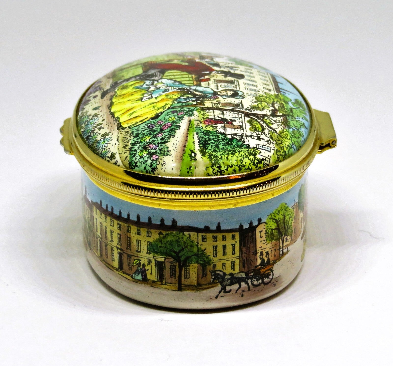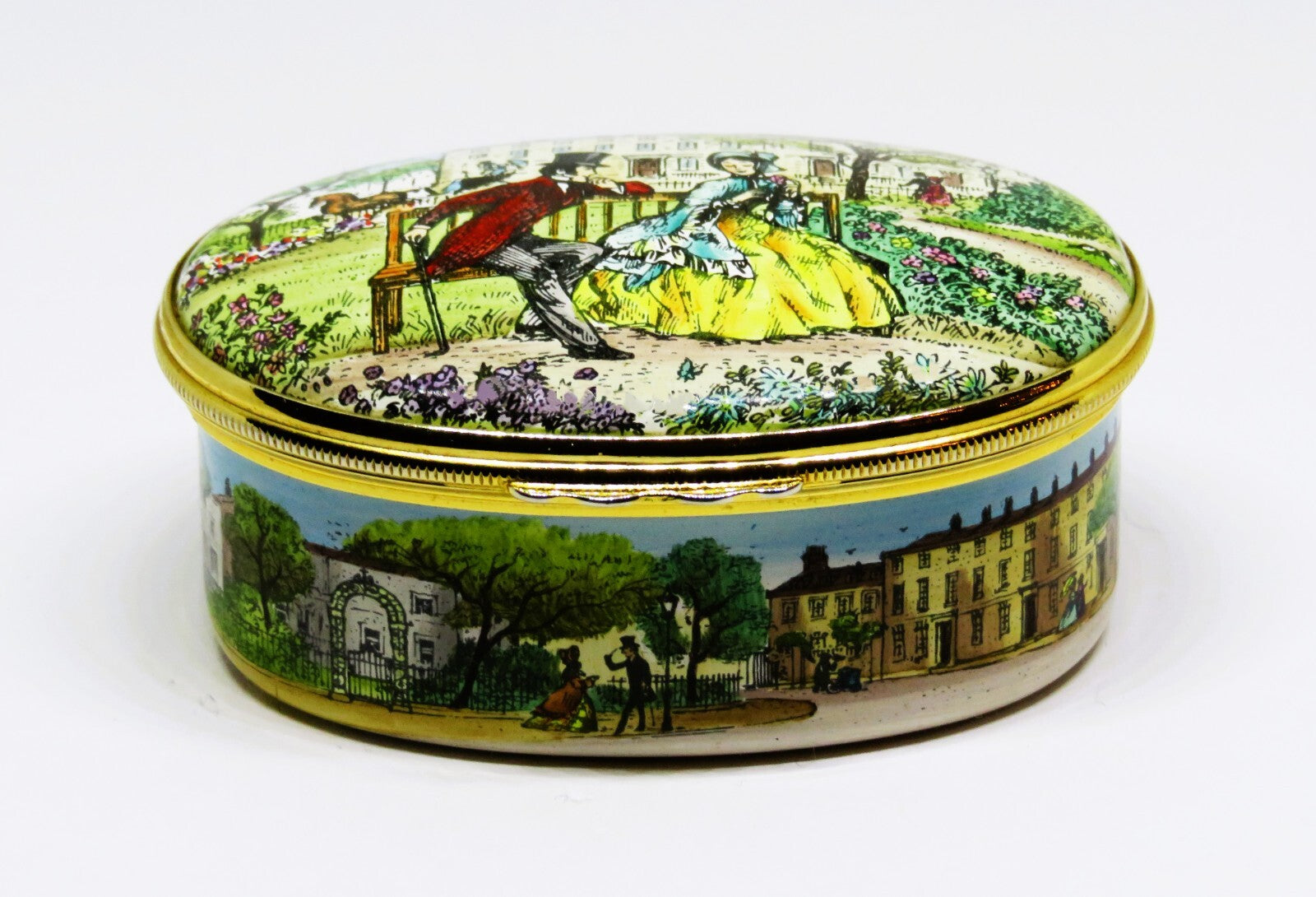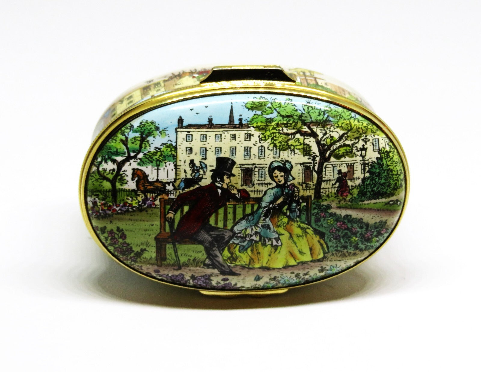 This LARGE, detailed, limited edition, Halcyon Days Enamels box has a scene of a courting, Victorian couple, on a bench, in the park. Flowers, trees, houses, and a horse and carriage are in the background. The couple and a panorama of the city are on the side. Inside is a quote from an Elizabeth Barrett Browning poem, on top: "If thou must love me, let it be for naught Except for love's sake only." A coach and horses are on the bottom. It is 1.6" by 2.5" with a height of 1.2". "Halcyon Days Enamels - England - Bilston & Battersea Enamels Revival", "THE LOVERS' BOX" and "In an edition limited to one thousand the number of this box is 264" are on the bottom. PLEASE CHECK MY OTHER AUCTIONS FOR MORE BOXES - I'LL BE LISTING ADDITIONAL ONES LATER IN THE WEEK. PLEASE CHECK BACK OFTEN.