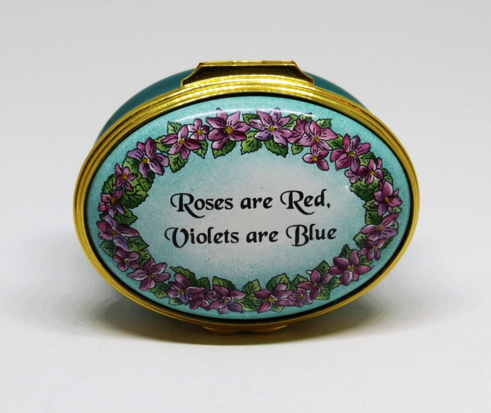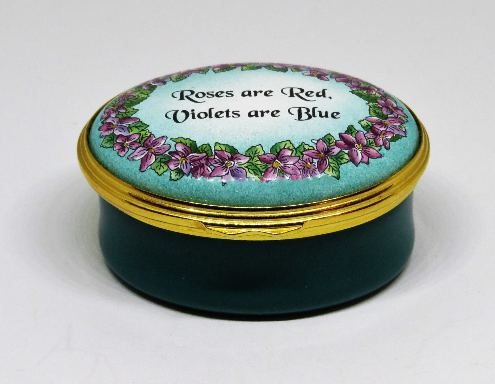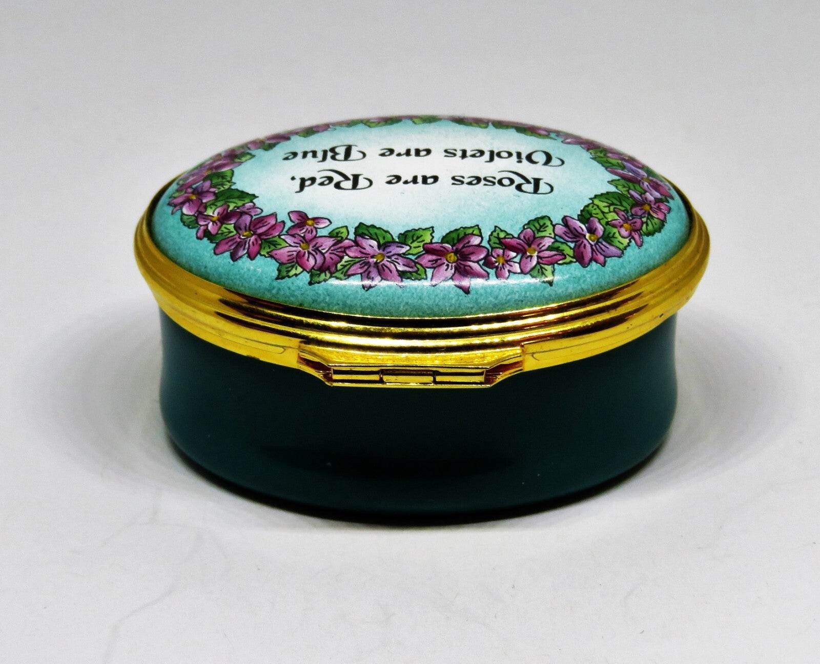 HALCYON DAYS ENGLISH ENAMEL BOX- "ROSES ARE RED, VIOLETS ARE BLUE ..." - FLOWERS