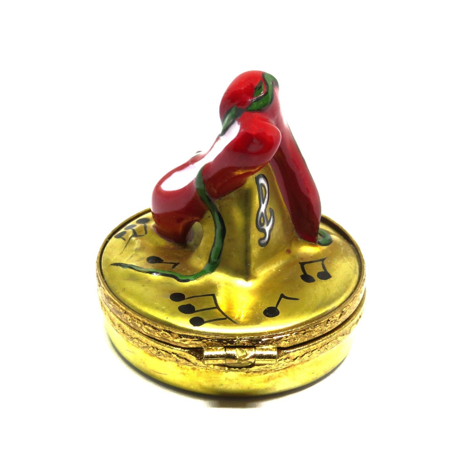 This wonderful, limited edition, Artoria, Limoges box illustrates "Nine Ladies Dancing" from the "Twelve Days of Christmas" carol. On top is a pair of red ballet slippers, with green ties, on a 22KT gold base decorated with musical notes. A ballet shoe is also the clasp, and "Nine Ladies Dancing", written in black script, is inside. The box has a diameter of 1.3" with a height of 1.6". On the bottom is: "Artoria - Peint Main - Limoges France - no 170" with the artist's initials. PLEASE CHECK MY OTHER AUCTIONS FOR MORE LIMOGES BOXES - I'LL BE LISTING ADDITIONAL ONES LATER IN THE WEEK. PLEASE CHECK BACK OFTEN.