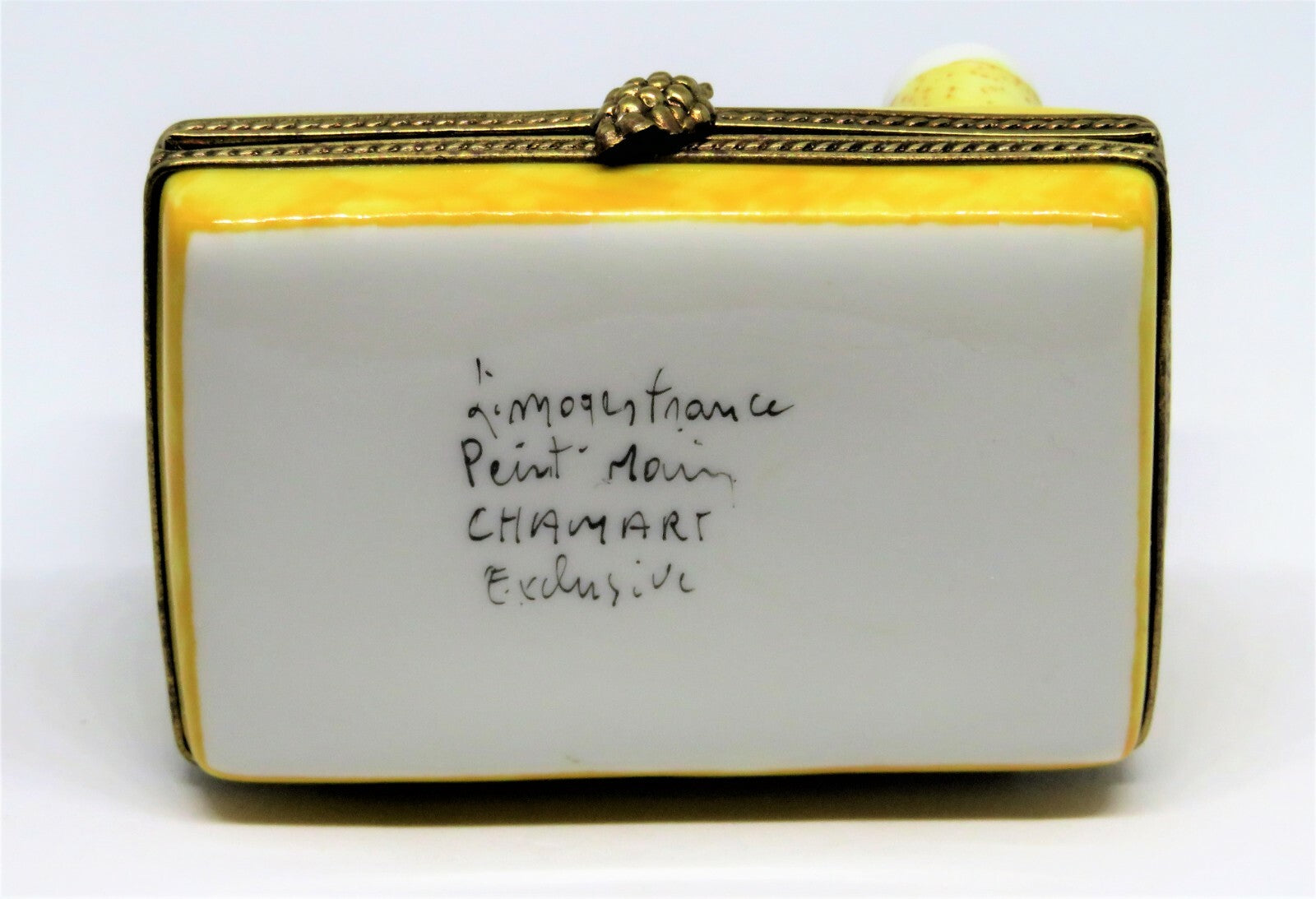 This unusual, Chamart, Limoges box, perfect for any special occasion, is a large, yellow rectangle, with a three dimensional, white banner, decorated with a black top hat, with a 22KT gold band, streamers, and "Celebrate" in gold script. A flute with champagne and a bottle of "CHAMPAGNE" are on the corners. Party poppers and confetti are painted on the base, and the clasp is a bunch of grapes. Streamers, confetti and a popper are painted inside. It is 1.7" by 2.6" with a height of 2.6". "Limoges France - Peint Main - Chamart Exclusive" is on the bottom. PLEASE CHECK MY OTHER AUCTIONS FOR MORE LIMOGES BOXES - I'LL BE LISTING ADDITIONAL ONES LATER IN THE WEEK. PLEASE CHECK BACK OFTEN.