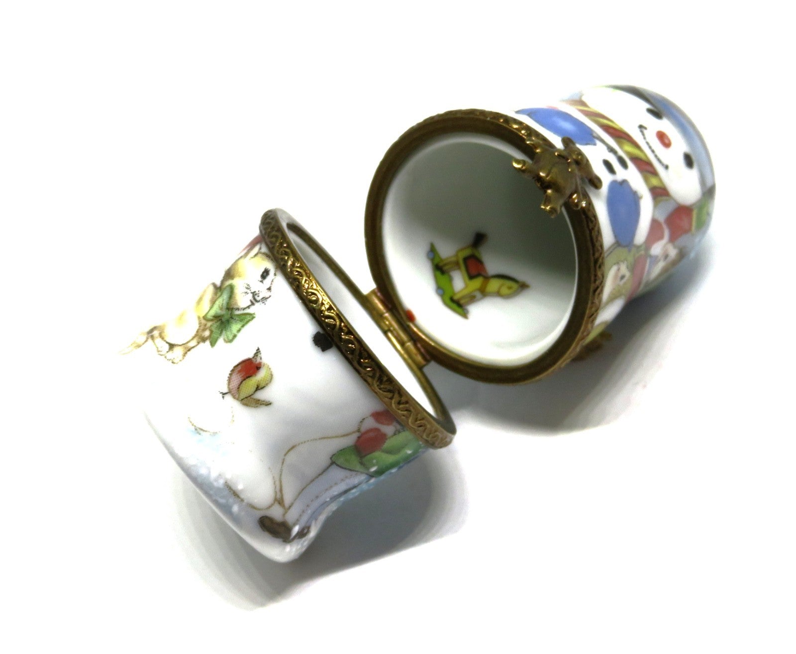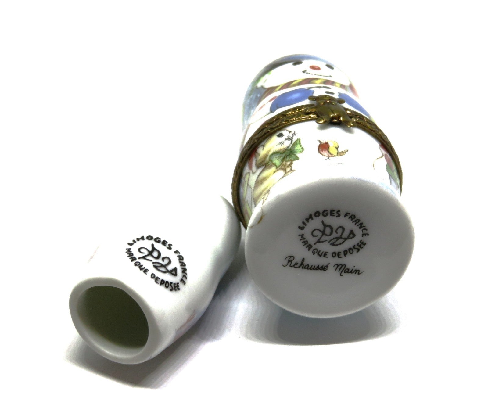 This wonderful, Parry-Vieille, snowman box is a set of two nesting pieces: a box and a figure. The smiling snowman has a bowler hat, a red and yellow scarf, and blue mittens. Painted on the box are two children, a kitten, a bird, and a decorated tree with presents. Snow flocking is in back. The clasp is a teddy bear, and a rocking horse is painted inside. Also inside is a removable, .75" diameter by 1.6" high snow woman, wearing a cloche hat, decorated with holly, and a red and white scarf, and stamped "Limoges France - PV - Marque Deposee" in back. The box has a diameter of 1.2" with a height of 2.4". On the bottom is: "Limoges France - PV - Marque Deposee - Rehausse Main." PLEASE CHECK MY OTHER AUCTIONS FOR MORE LIMOGES BOXES - I'LL BE LISTING ADDITIONAL ONES LATER IN THE WEEK. PLEASE CHECK BACK OFTEN.
