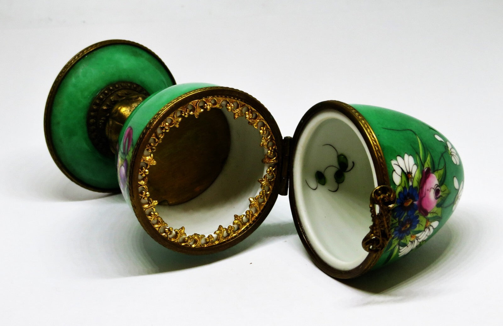 This beautiful, Vialard, Limoges box is a deep green, vertical egg, on a brass pedestal, with a porcelain base, rimmed in brass. The brass pedestal isn't straight. A bouquet of flowers, with a pink rose, white daisies, blue flowers, and two tone green leaves, tied with a pink and burgundy bow, is in front. An ornate double loop is the clasp, and leaves on a vine are painted inside. Also inside is a filigreed metal border, with a fleur-de-lis design ,and a metal platform. It is probably missing a perfume bottle. The large egg has a diameter of 1.8" with a height of 4". "Peint Main - F Vialard - Limoges France" is on the bottom. PLEASE CHECK MY OTHER AUCTIONS FOR MORE LIMOGES BOXES - I'LL BE LISTING ADDITIONAL ONES LATER IN THE WEEK. PLEASE CHECK BACK OFTEN.