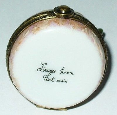 This adorable little Christmas box is a snowman with a red, green, and white muffler, green mittens, and a brown hat, next to a pile of gifts. The pink and white base is flocked with snow. The clasp is a button and a scene of a country cottage, in the summertime, is painted inside. It has a diameter of 1.4" with a height of 1.8". On the bottom is: "Limoges France - Peint Main." PLEASE CHECK MY OTHER AUCTIONS FOR MORE LIMOGES BOXES - I'LL BE LISTING ADDITIONAL ONES LATER IN THE WEEK. PLEASE CHECK BACK OFTEN.