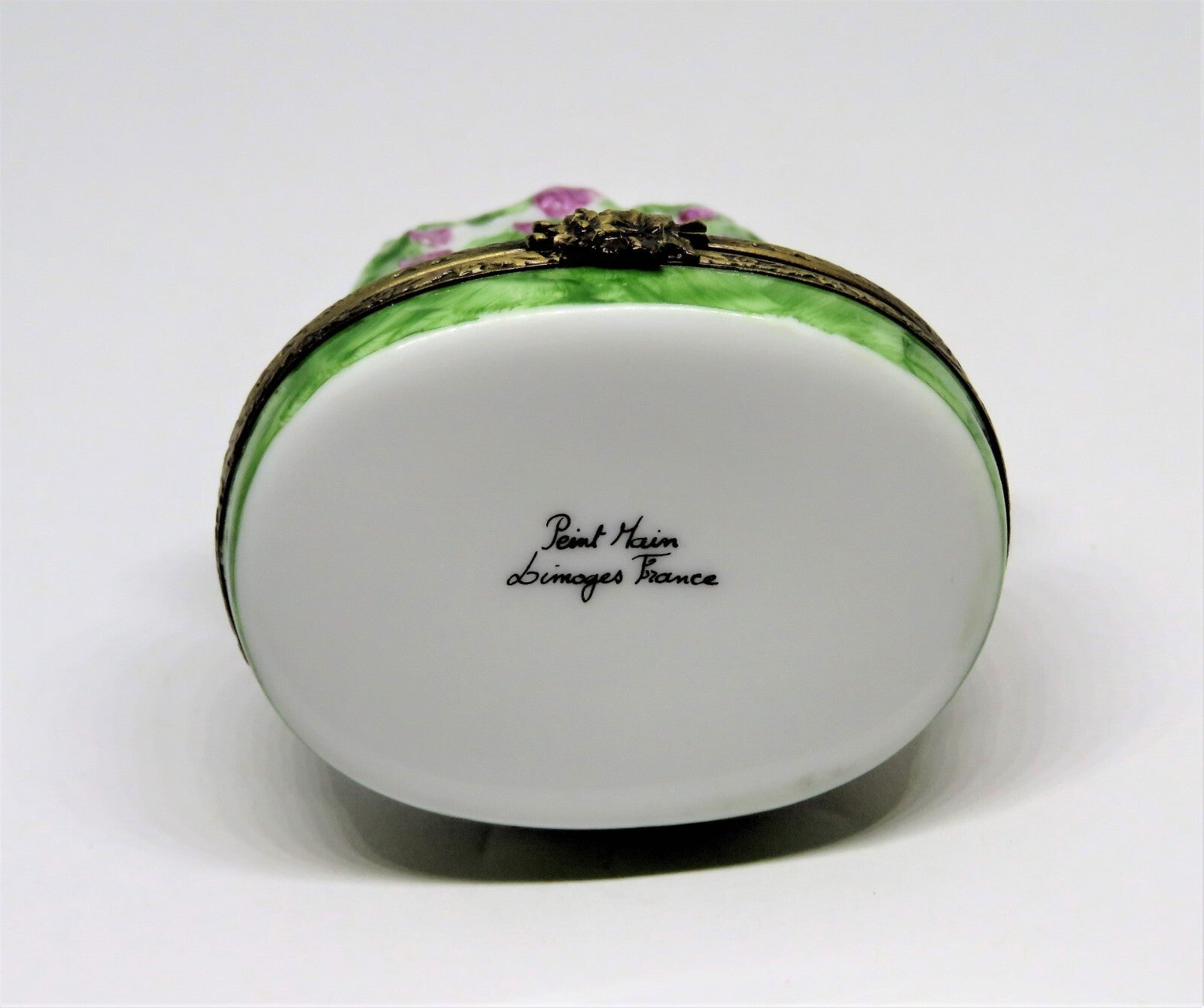 This adorable, Limoges box is a brown bunny, standing in front of a white picket gate, under an arbor, with vines of pink flowers. Three pots of flowers are on each side, and grass is on the base. Stemmed flowers and leaves comprise the clasp, and pink flowers are painted inside. It is 1.75" by 2.25" with a height of 3". "Peint Main - Limoges France" is on the bottom. PLEASE CHECK MY OTHER AUCTIONS FOR MORE LIMOGES BOXES - I'LL BE LISTING ADDITIONAL ONES LATER IN THE WEEK. PLEASE CHECK BACK OFTEN.