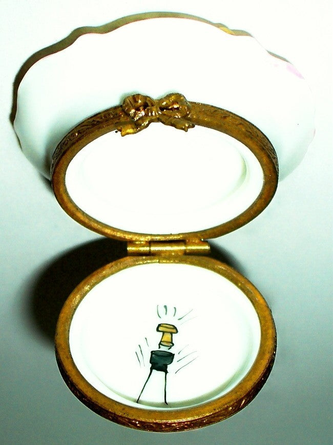 This delectable box is a white plate with a pink border, a pink stripe on bottom, and a metal fork. The plate is decorated with a gift, a cracker, a sparkler, a glass of champagne, confetti, and streamers. In the center is a two layer cake with pink filling and icing, on a lace doily. "Happy Anniversary" is written in black script on top. A ribbon bow is the clasp, and a champagne bottle with a popping cork is painted inside. It has a diameter of 1.8" with a height of .9". On the bottom is: "Peint Main - Limoges France" with the artist's initials. PLEASE CHECK MY OTHER AUCTIONS FOR MORE LIMOGES BOXES - I'LL BE LISTING ADDITIONAL ONES LATER IN THE WEEK. PLEASE CHECK BACK OFTEN.