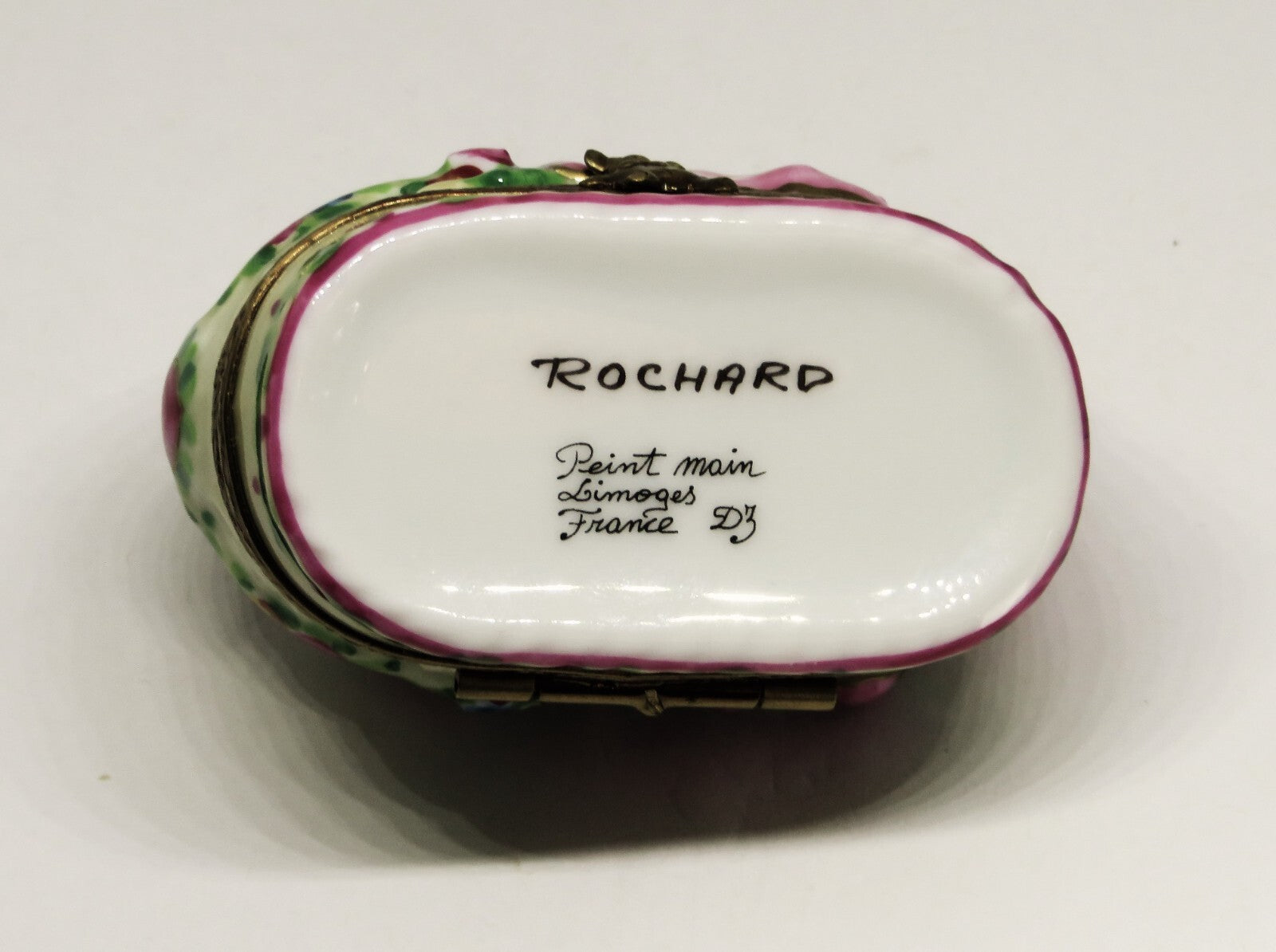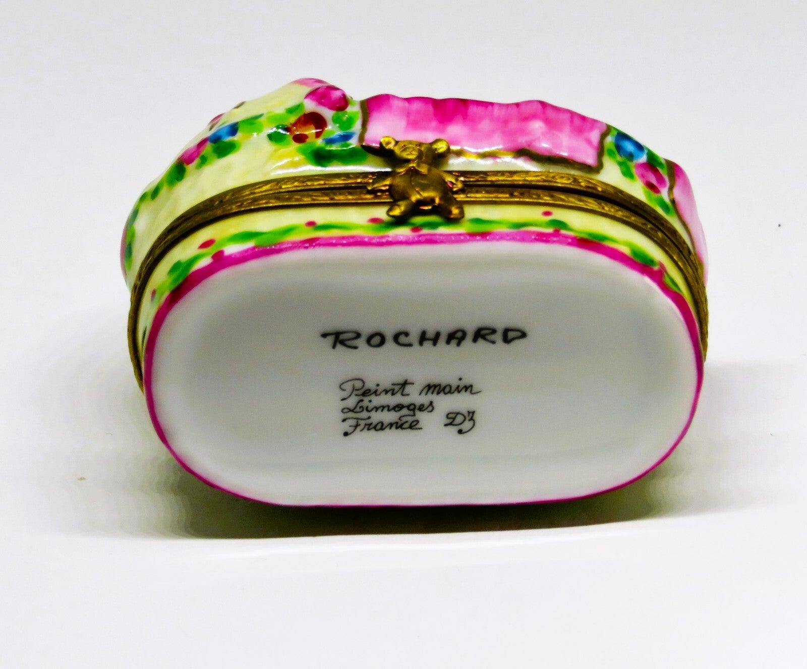 This beautiful, Rochard, Limoges box features an adorable, brown haired, baby girl, wearing a pink diaper, with burgundy dots, holding a stuffed toy, lying on a pink blanket, in a basket. The basket is decorated with blue flowers, pink roses and foliage, with a pink bow and heart, edged in 22KT gold, on the hood. The clasp is teddy bear, and a pink and burgundy "BABY" bib is painted inside. The basket is 1.2" by 2.1" with a height of 1.6". "Rochard - Peint Main - Limoges France" with the artist's initials is on the bottom. PLEASE CHECK MY OTHER AUCTIONS FOR MORE LIMOGES BOXES - I'LL BE LISTING ADDITIONAL ONES LATER IN THE WEEK. PLEASE CHECK BACK OFTEN.