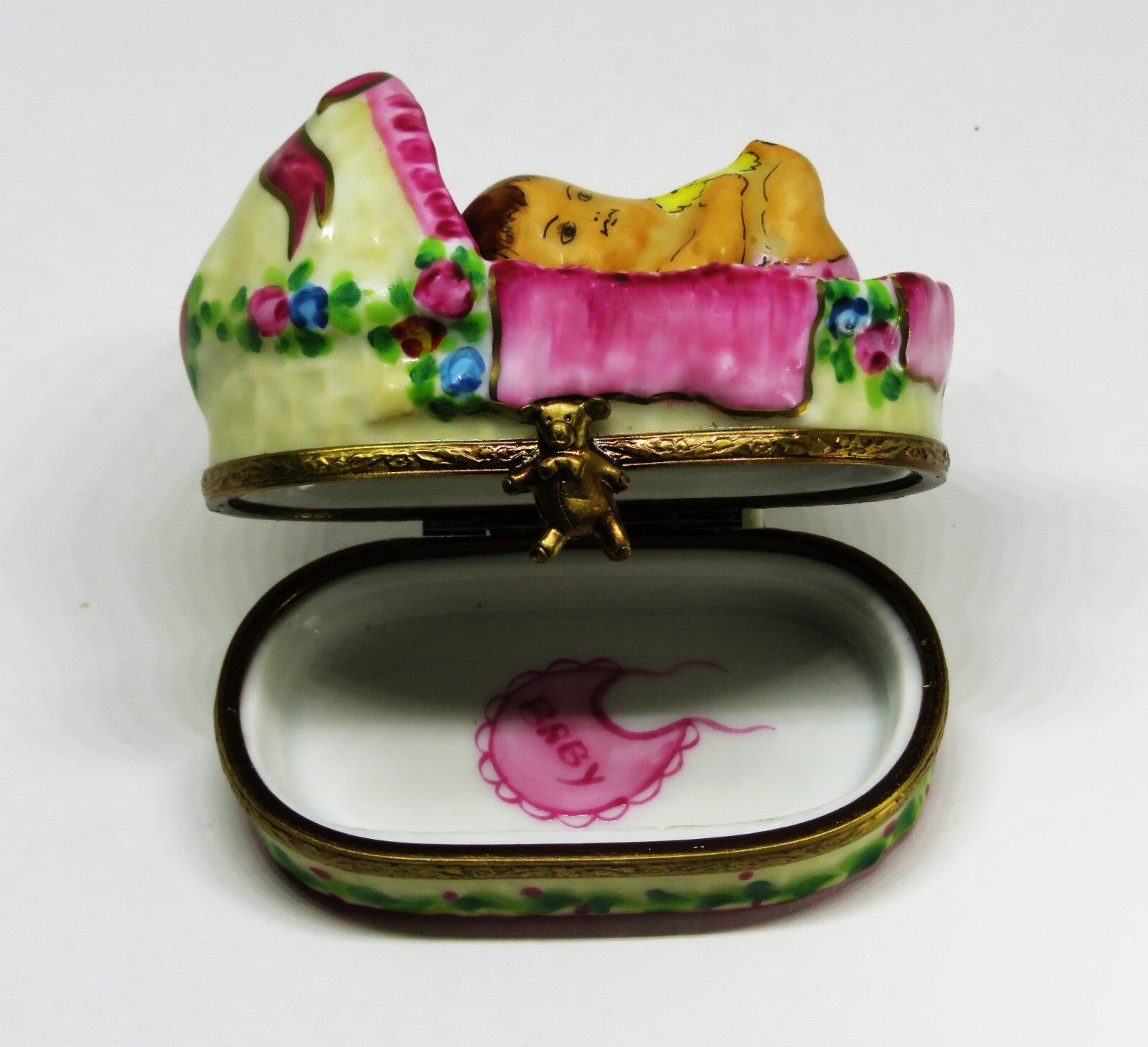 LIMOGES FRANCE BOX - ROCHARD - BABY GIRL IN A BASKET - ROSES & BOW & HEART - BIB