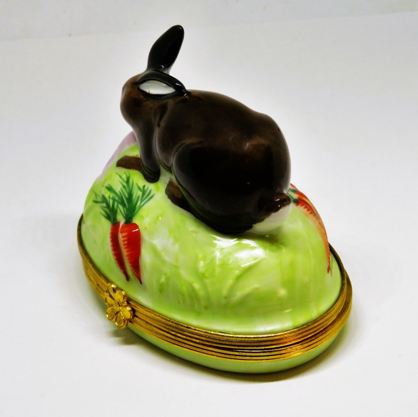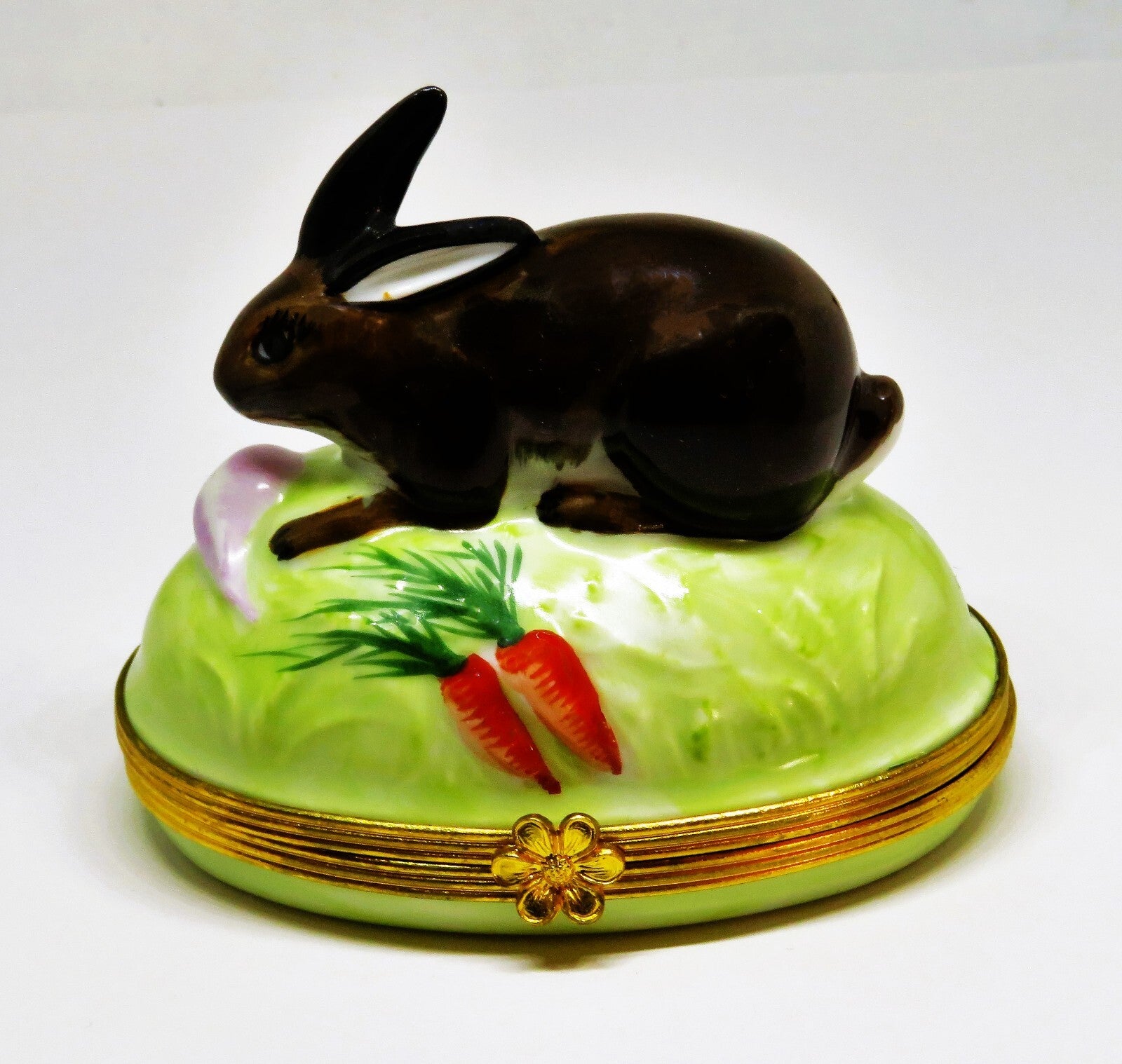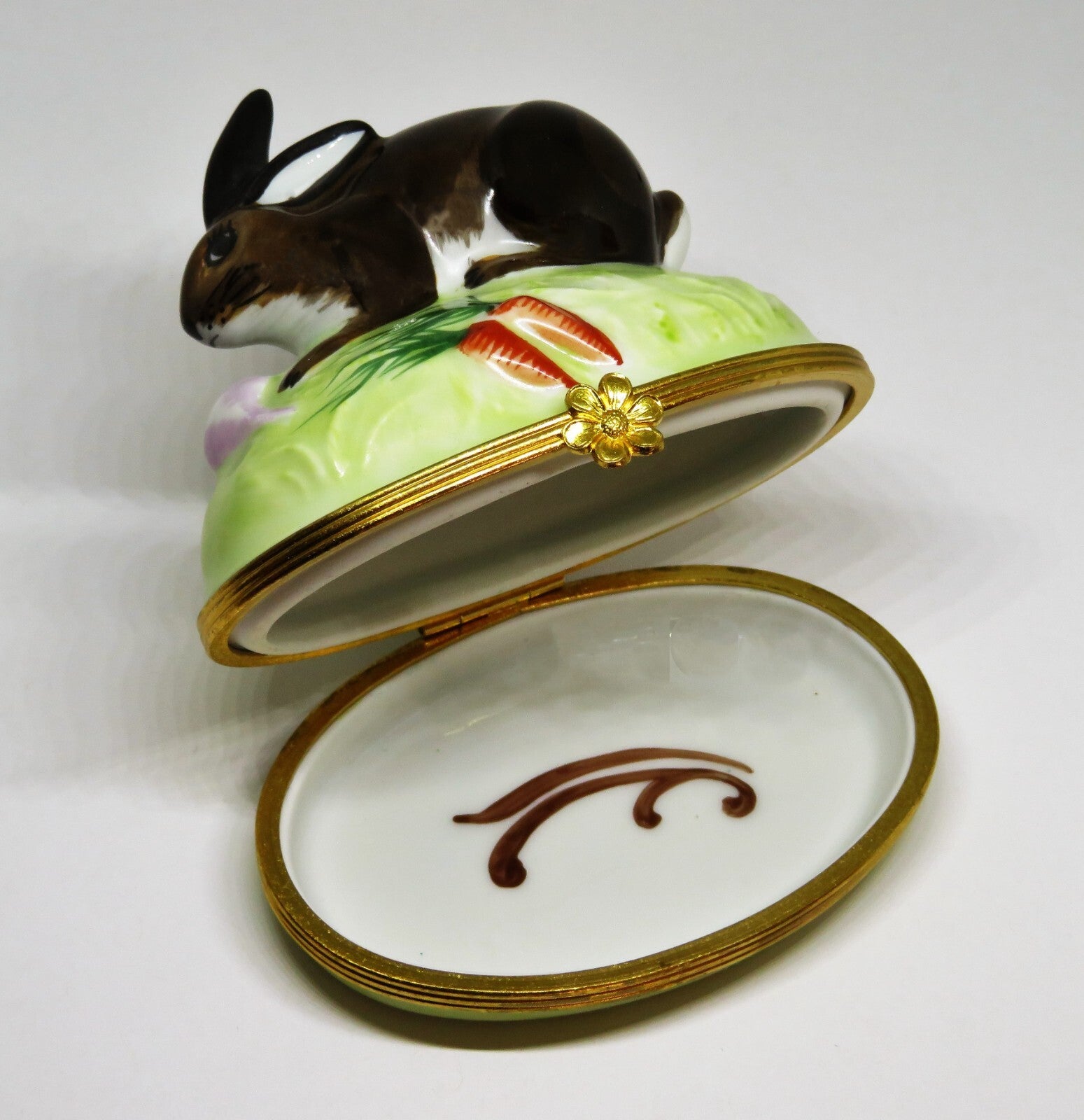 This LARGE, vintage, Limoges box, made for Tiffany & Co., is a chocolate brown bunny, with a white cotton tail, on a light green base, decorated with carrots and a turnip. A flower is the clasp, and a brown, feather swirl is painted inside. The box is 2.2" by 3.3" with a height of 3.2". "Tiffany - Limoges France - Peint Main" with "Limoges France" also stamped in green, is on the bottom. PLEASE CHECK MY OTHER AUCTIONS FOR MORE LIMOGES BOXES - I'LL BE LISTING ADDITIONAL ONES LATER IN THE WEEK. PLEASE CHECK BACK OFTEN.