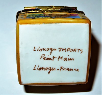 This adorable, Limoges Imports box is a domed, brown 'wooden' trunk with black studs. Each side has a scene of a teddy bear, representing each of the four seasons. In front is the teddy at the beach, in the summertime. He is playing with his toy drum by the Christmas tree in the winter in back. On the sides teddy is picking apples in autumn, and he is on the farm with newborn chicks in the spring. The clasp is a teddy bear. Inside is a 1.3" high, removable porcelain, brown teddy bear with red paw pads and a red collar. The box is 1.4" by 1.5" with a height of 1.7". On the bottom is "Limoges Imports - Peint Main - Limoges France." PLEASE CHECK MY OTHER AUCTIONS FOR MORE LIMOGES BOXES - I'LL BE LISTING ADDITIONAL ONES LATER IN THE WEEK. PLEASE CHECK BACK OFTEN.